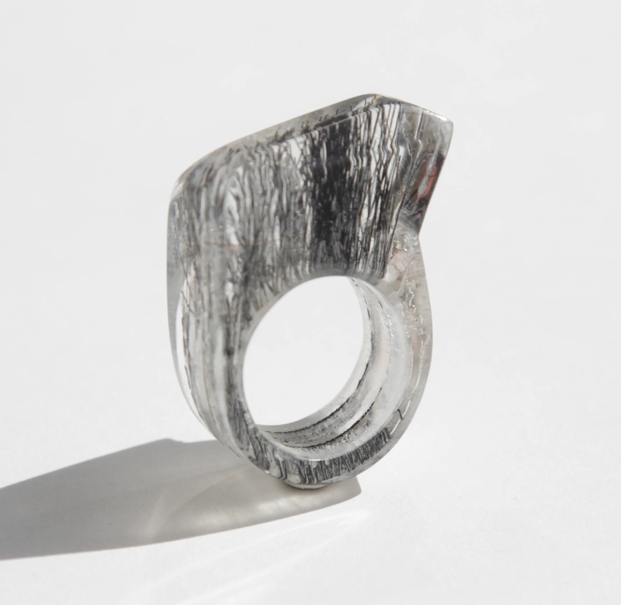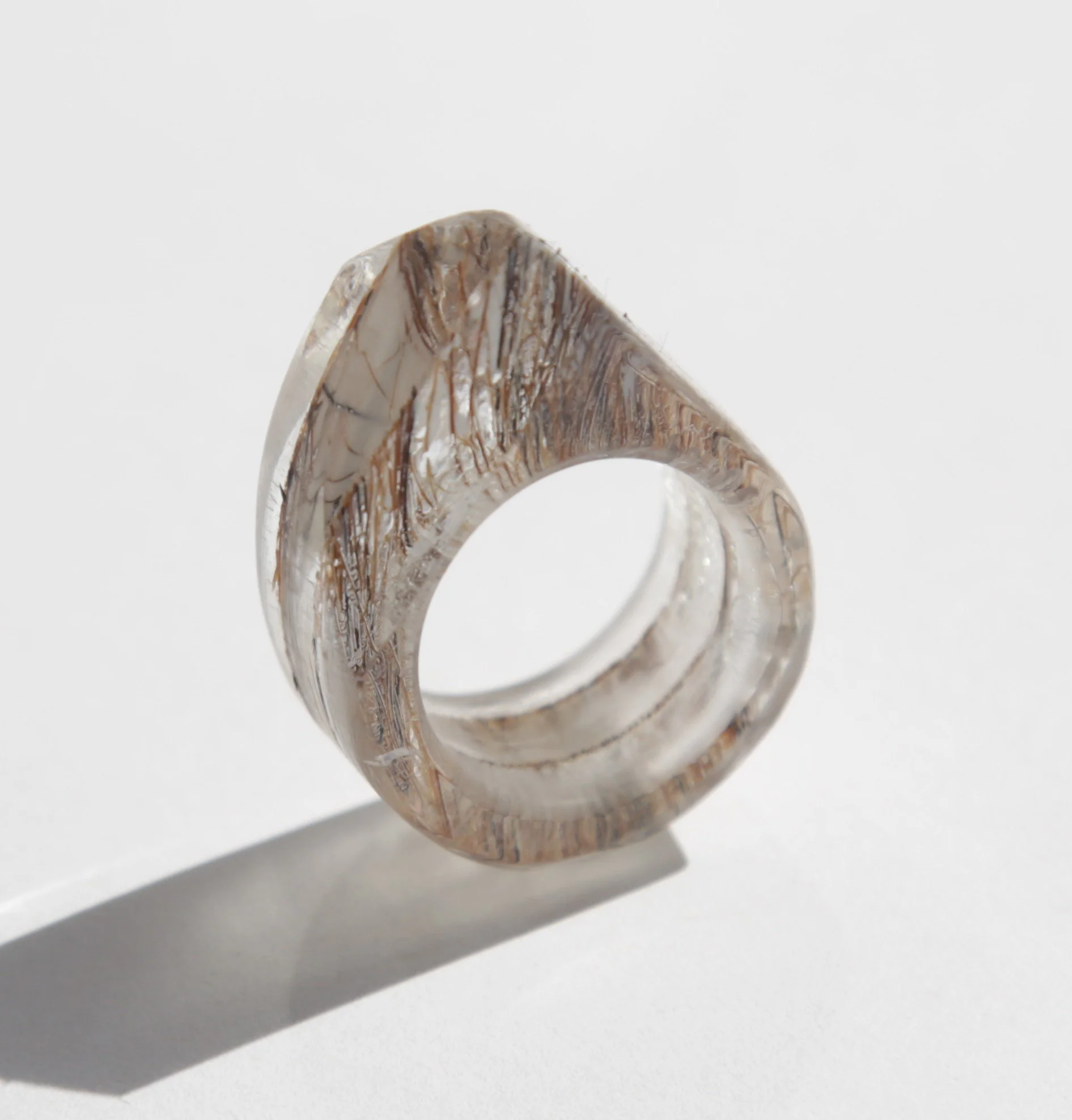 Remembrance jewelry, ring made with tail hair of a horse that passed the rainbow bridge, Laminated recycled perspex and horses’ hair.